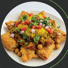 Made of samosa, chickpeas, chutney, spices, onions. Allergen: Cereals (Wheat).