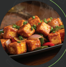 Spicy, tangy Indian Cottage Cheese tossed with peppers in sizzling sauce. Allergen: Milk, Soy.