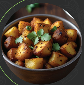 Spicy, tangy potatoes with coriander, chilies, and a burst of flavors. Allergen: None specified.