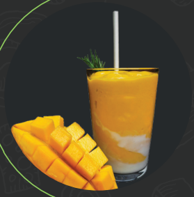 Refreshing yogurt-based drink blended with ripe mangoes Allergen: Milk, Nuts (Pistachios).