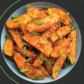 Crispy potato fingers tossed in sweet, spicy honey chilli glaze. Allergen: Soy, Sesame.