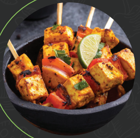Grilled cottage Cheese skewers with veggies, marinated in shashlik sauce Allergen: Milk. Nuts (Cashew), Mustard.