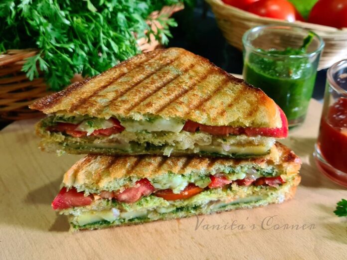 Vegetable sandwich with chutney and spices - grilled to perfection. Allergen: Cereals (Wheat), Milk.