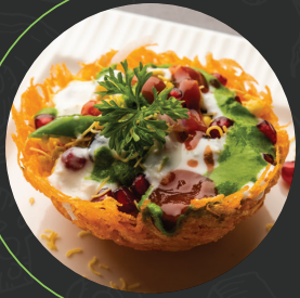 Crispy potato basket packed with Lucknow's chaat flavors. Allergen: Milk, Cereals (Wheat).