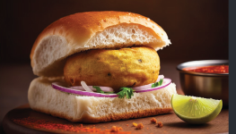 Spicy fritter in a soft bun Mumbai's street soul. Allergen: Cereals (Wheat), Peanuts, Mustard. Milk.