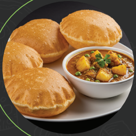 Fluffy pooris paired with spiced potato curry pure comfort on a plate. Allergen: Mustard, Cereal (Wheat).