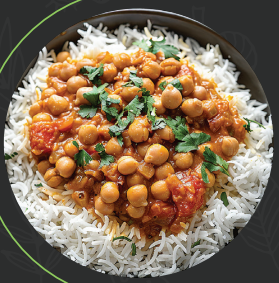 Comfort on a plate: spiced beans or chickpeas with fluffy rice Allergen: None specified.